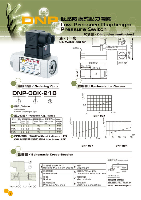 DNP压力继电器型号说明 DNP -08K -21B 型式 压力调整范围 设计号 一般型隔膜式 见规格表 21B DNP压力继电器规格表 型 号 压力调整范围 bar 最高压力 bar 重量Kg DNP-02K-21B 0.3∼2 80 0.2 DNP-...