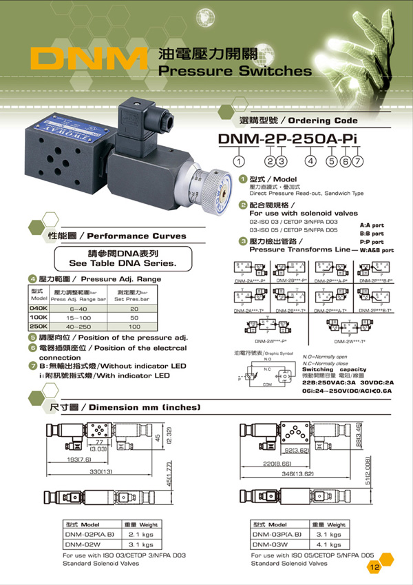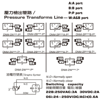 DNM压力继电器型号说明 DNM -2 P -250 A -P I 型式 配合阀规格(2,3) 压力检出管路 压力范围 调压向位 电器插头座位 指示灯 压力直读式, 叠加式 02-ISO 03 / CETOP 3/NFPA D03 03-ISO 05 / CETOP 3/NFPA...